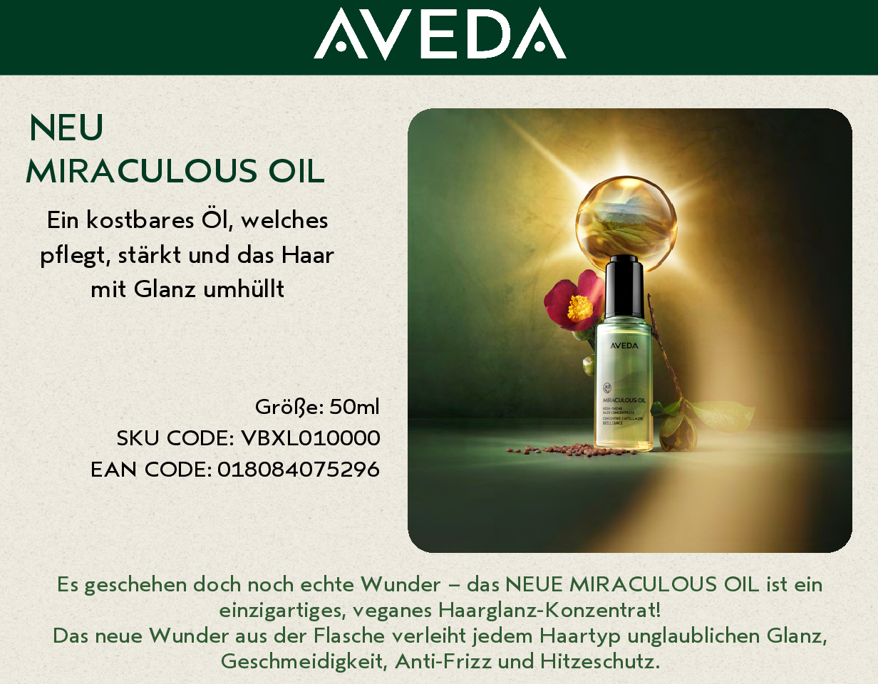 Es geschehen also doch noch echte Wunder im Hause von AVEDA! Das neue Miraculous ÖL ist einzigartiges, veganes Haarglanz-Konzentrat! Das neue Wunder aus der Flasche verleiht jedem Haartyp unglaublichen Glanz, Geschmeidigkeit, Anti-Frizz und Hitzeschutz.